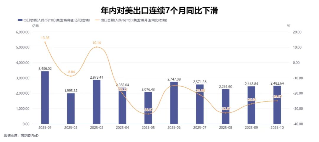 凭据海关总署统计,本年前10个月,我国对好意思收支口总值3.38万亿元,同比着落15.9%,其中,对好意思出口2.52万亿元,同比着落17%,对好意思入口8511.8亿元,同比着落12%。从10月单月来看,对好意思出口2482.6亿元,同比下滑25%。