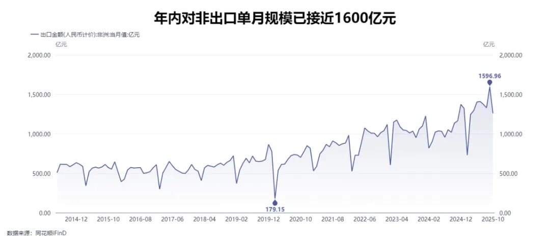 《逐日经济新闻》记者梳理近10年中非经贸数据发现,从单月出口限制来看,2022年下半年,中国对非单月出口限制初次梗阻了1000亿元。随后,2024年单月出口限制梗阻1200亿元,何况在本年9月接近1600亿元。
