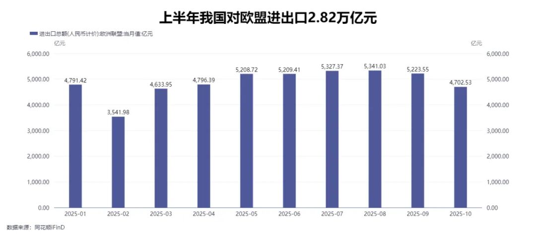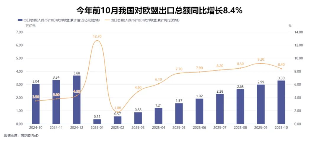 回望2024年同期,中国对欧盟出口限制约为3.04万亿元,同比增长3.5%。这意味着,本年前10个月我国对欧盟出口的增速大幅擢升。