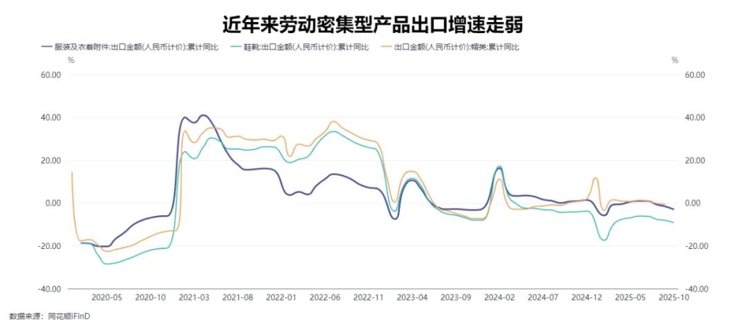 与此同期,以服装、鞋帽、塑料成品为代表的劳动密集型家具出口增速则全体走弱。前三季度,我国服装及衣着附件出口金额同比着落1.6%;鞋靴出口金额同比着落8.1%;出口帽类家具金额同比着落0.6%。