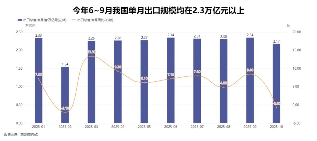 但从本年下半年全体情况看,6至9月份,我国单月出口限制均越过2.3万亿元,处于历史较高水平。9月出口同比增长8.4%,限制更是创同期历史新高。